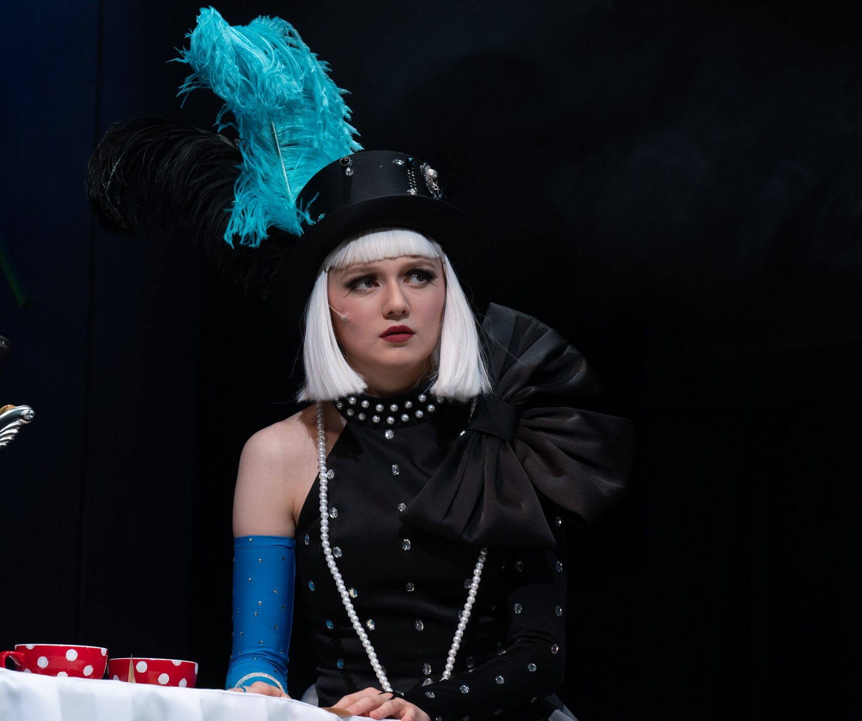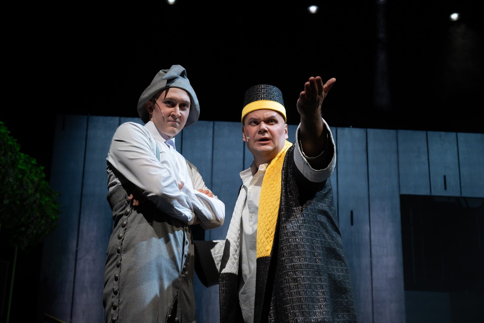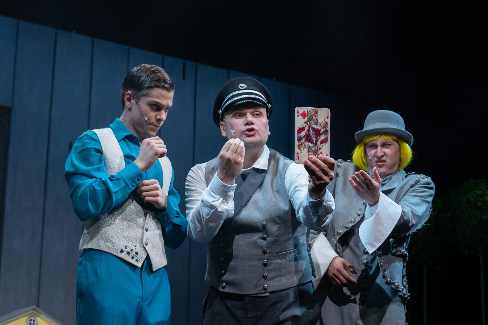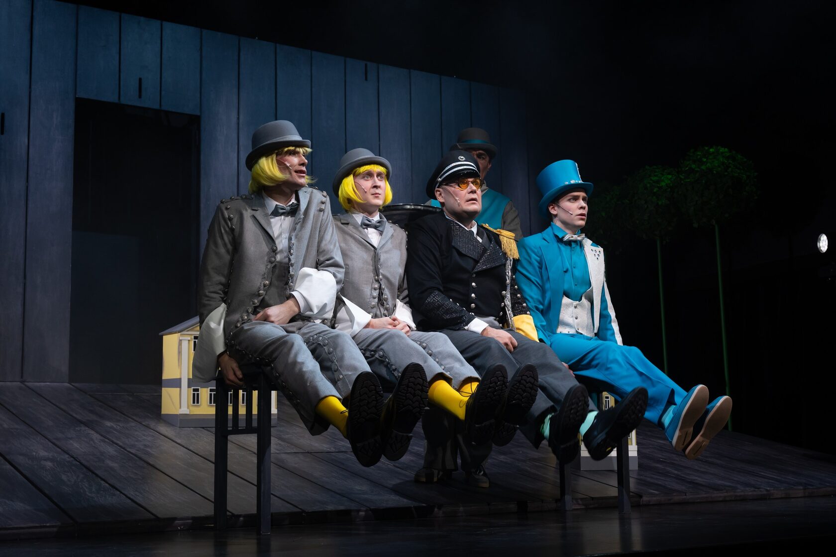 Костюмы спектакля продолжают эту стилистику. В них сочетаются элементы классического костюма и яркие, почти карикатурные детали. Контрастные цвета, необычные аксессуары и характерные силуэты делают персонажей запоминающимися и добавляют происходящему оттенок гротеска.