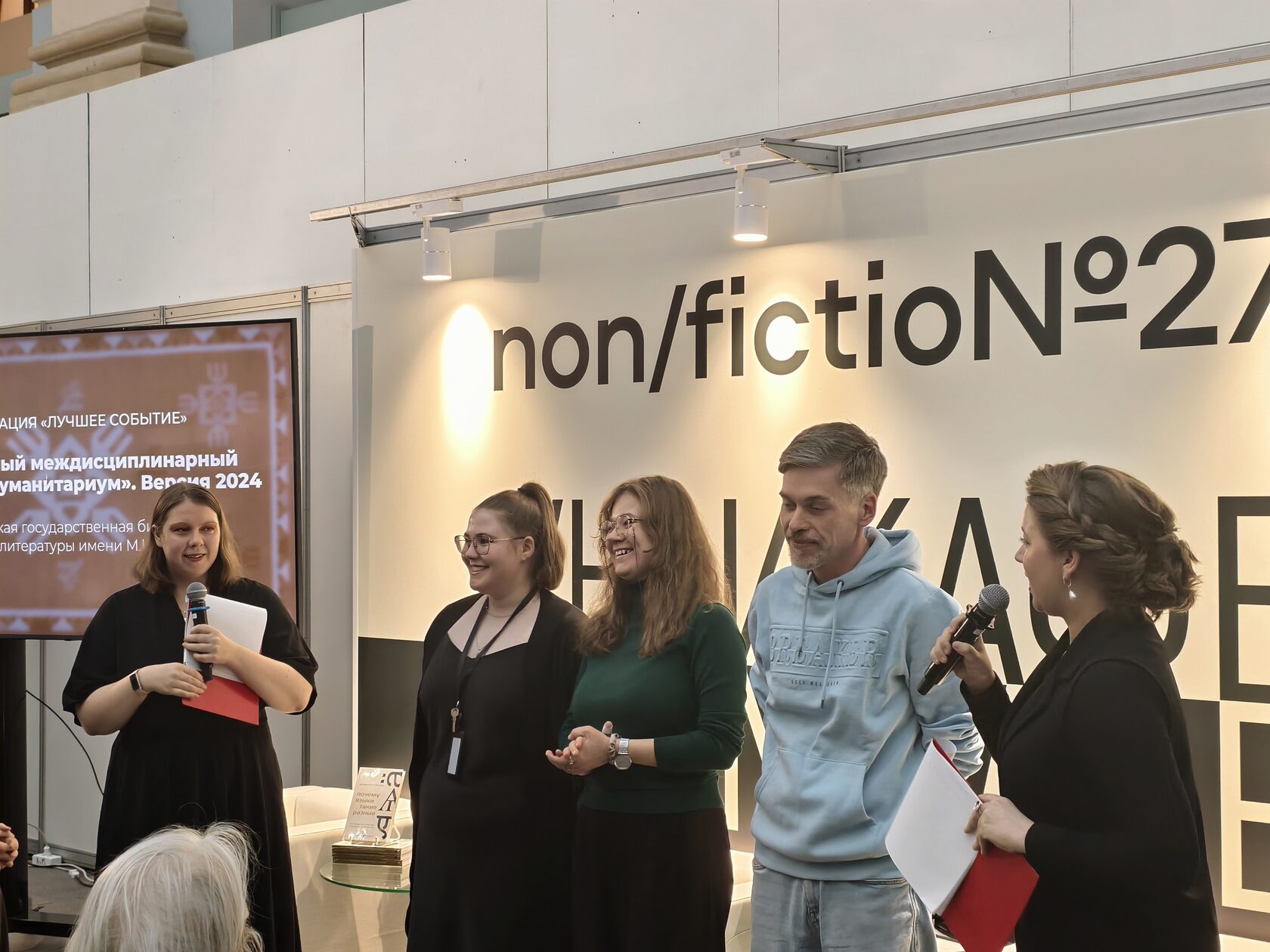 В номинации «Лучшее событие» — Всероссийская государственная библиотека иностранной литературы имени М.И. Рудомино с мероприятием «IV Ежегодный междисциплинарный фестиваль «Гуманитариум». Версия 2024». Организаторы проекта из Центра междисциплинарных исследований Библиотеки иностранной литературы, член Постоянного комитета секции по истории библиотек Российской библиотечной ассоциации Владимир Фролов, Александра Новикова и Людмила Феноменова, рассказали, что для них награда — новый импульс к действию: «Наша задача в проекте "Гуманитариум" — показать людям, какие существуют языки и культуры и как их интересно изучать. У нас получилось это сделать и в прошлом году, и в этом. Эта награда станет для нас огромным стимулом сделать в следующем году ещё больше».